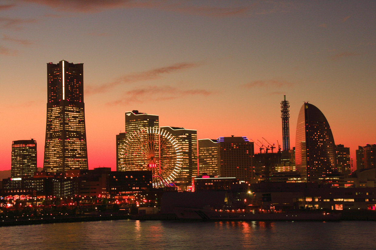 大桟橋から見たみなとみらいの夕景である。夕景の撮影は、日没のあと空がどんどん暗くなって行き、逆にビルなどの明かりが段々目立つようになって行く、両方の明るさが同じ程度になる非常に短い時間帯の勝負になる。そのためなかなかデリケートではあるが、うまく行けば昼間とは全く違う表情の街をつかまえることができる。 |