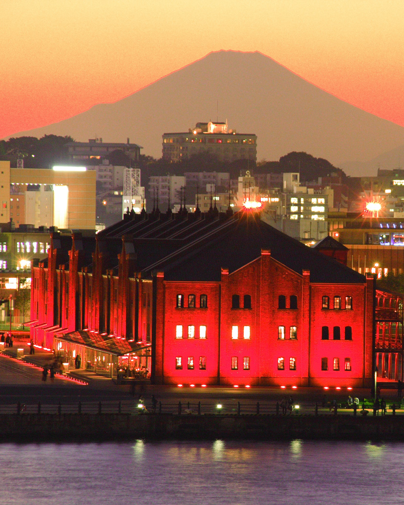 夕空をバックに浮かび上がった富士山のシルエットと赤くライトアップされた赤レンガ倉庫の競演である。 |