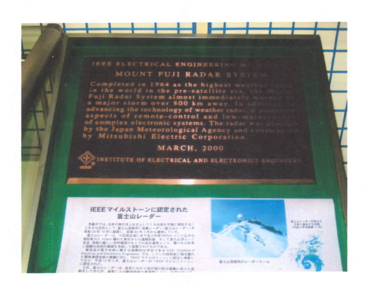 富士山レーダーのIEEE Milestone銘板 (撮影:大野) 東京大手町の気象庁本館気象科学館に 展示されている銘板 |