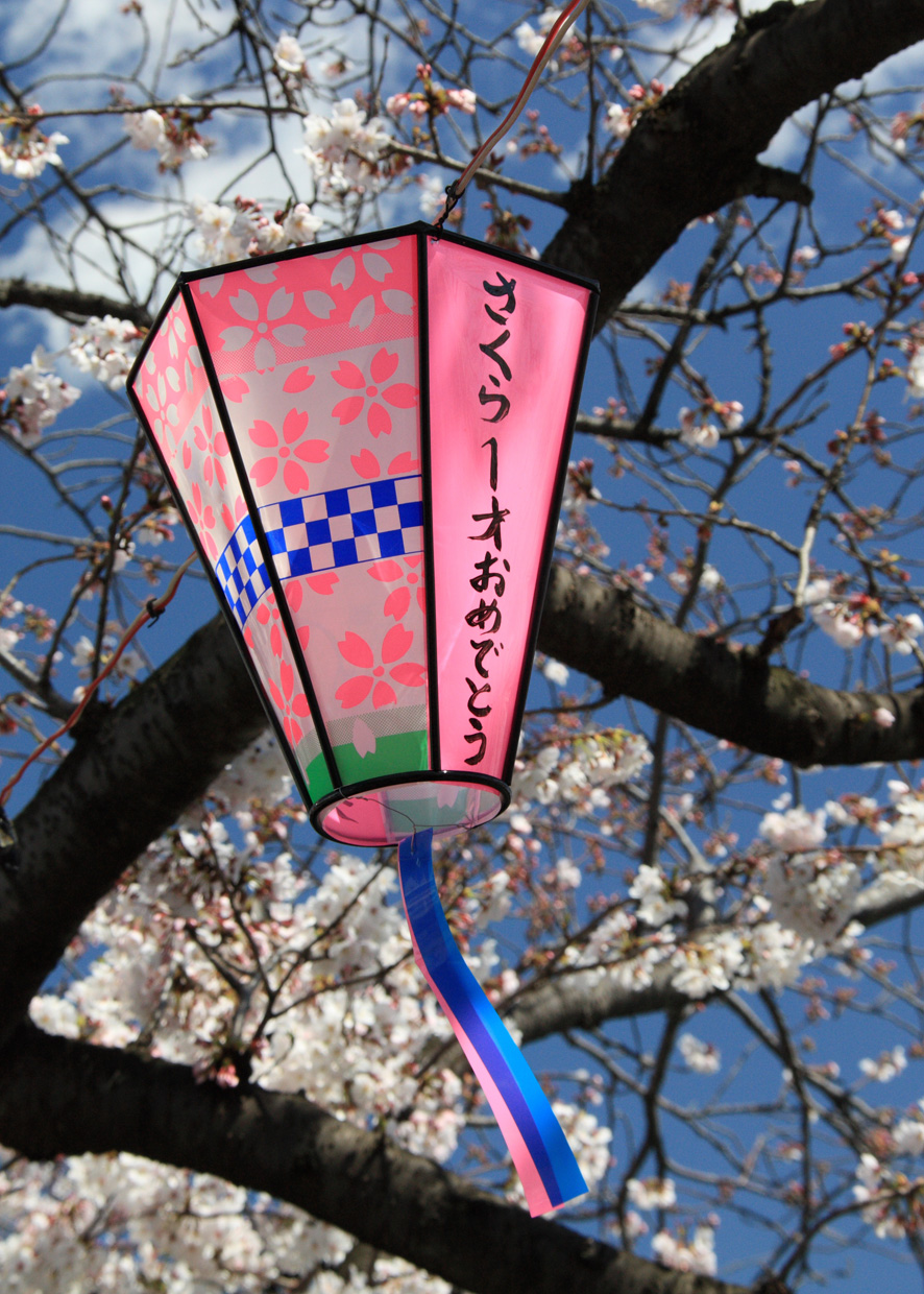 最初は普通の鯉のぼりを撮すつもりだったが、なかなか気に入ったものに出会えなかったので伊勢佐木町商店街の鯉のぼり風横断幕を狙うことに方針変更。通りを行ったり来たりしながら縦位置、横位置合せて50カットほどを撮影、最終的に左の写真を選んだ。 ポイントは ①赤い“鯉のぼり”が目立つ位置にありバランスも良い(タイトルの「泳げないよー」を強調するために両端のロープをしっかり撮したかった) ②“鯉のぼり”の列が逆三角形の構図で遠近感がよく出ている ③右下のカップルがちょうど良い位置に来てくれた、など (中央下の女性は邪魔だがやむを得ない) (2)入選「さくらチャンおめでとう」:横浜大岡川プロムナード桜まつりの ぼんぼりを主題にした作品