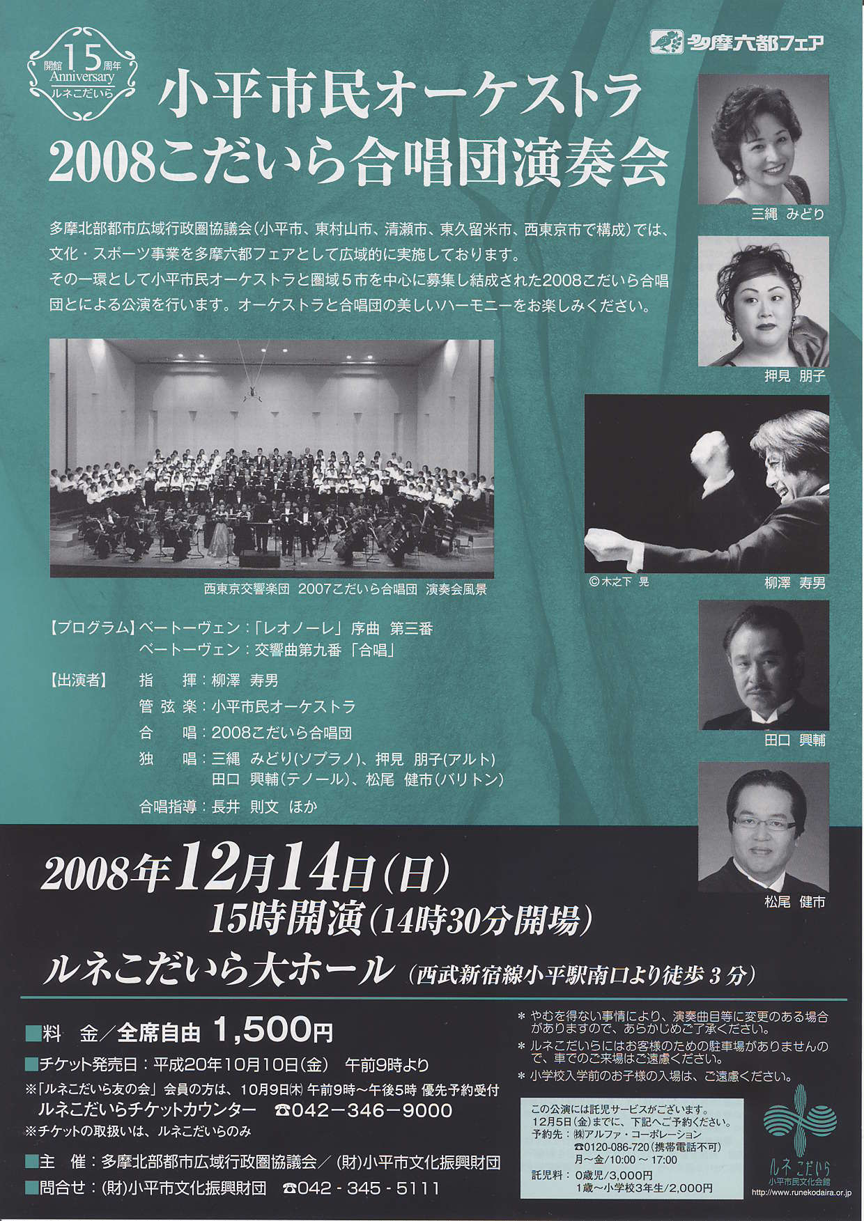 指揮は柳澤寿男(コソボフィルハーモニー交響楽団常任指揮者)、ソリストはすべて二期会会員で三縄みどり(ソプラノ)、押見朋子(アルト)、田口興輔(テノール)、松尾健市(バリトン)の一流のプロです。合唱は多摩六都5市(小平市・東村山市・清瀬市・東久留米市・西東京市)から約200名の合唱経験者が集まって結成された「2008こだいら合唱団」です。 演奏曲目はベートーベン作曲「レオノーレ序曲 第3番」とベートーベン作曲「交響曲第九番[合唱]」です。 「第九」は、小平市民オーケストラとしては3回目(私としては2回目)ですが、かなりの難曲ですので「レオノーレ序曲」とともに現在毎週日曜日に仕上げの練習に励んでいるところです。 第九の演奏会はいつもチケット発売とほぼ同時に完売になり満席の状態での演奏となりますので、団員一同張り切って当日の演奏に臨むことになります。