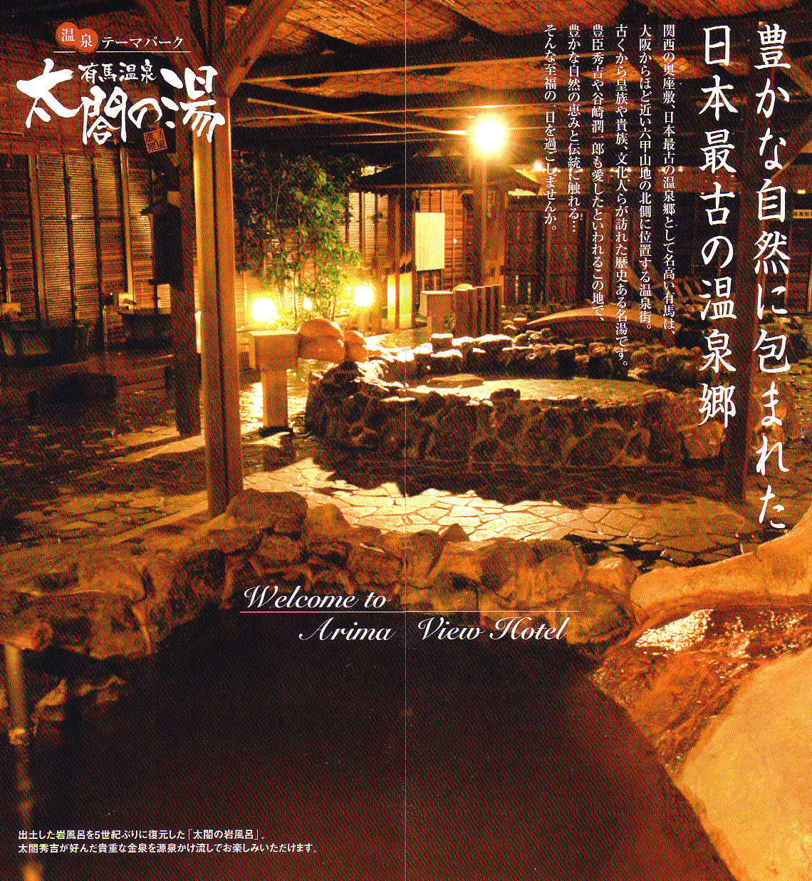 1.場所:有馬の街は六甲山の北側にあり、ホテルや旅館、そして土産物屋が殆ど、言う温泉街である。ここに日帰りで入れる施設「太閤の湯」がある。なお、この施設を含むように「有馬ビューホテル」が建てられており、今回はこのホテルに宿泊した。日帰りなら2400円だが、ホテル宿泊なら、無料で利用出来る。