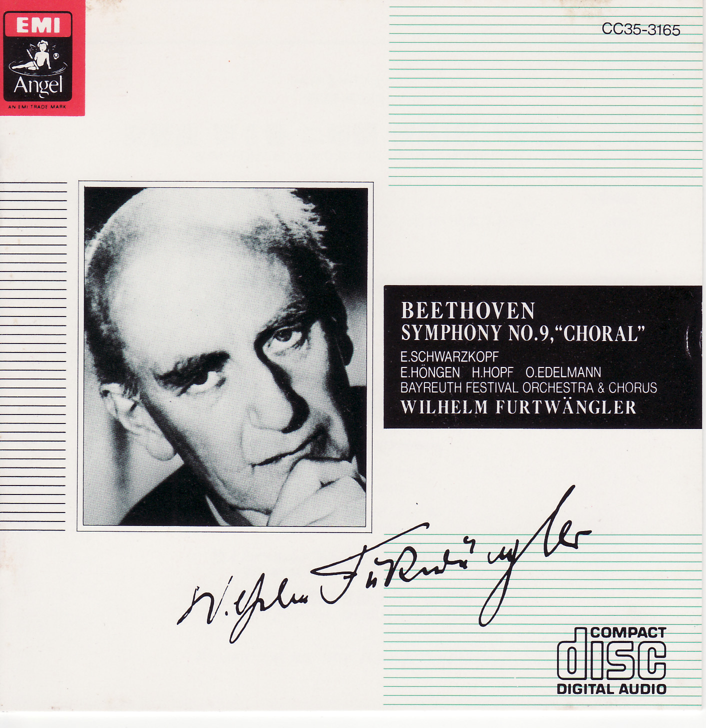 所で、多くの録音が残されている「第九」の中で最高傑作と言われているものが『フルトヴェングラーの「第九」』(写真)で、1951年バイロイト祝祭劇場でのライブ録音である。 戦時中のナチスとの関係から公的活動を禁じられていたバイロイト祝祭劇場が禁を解かれ、戦後初めて活動を再開した時の記念コンサートで演奏された。 余談であるが、1980年CDの規格を決めるに当たってディスクの直径を11.5cmにするか12cmにするかで議論が分かれた時、この『フルトヴェングラーの「第九」』(演奏時間約74分)が入ることという条件が決め手になって12cm案が採用されたと言われている。 このサイズはそのままDVDにも受け継がれている。