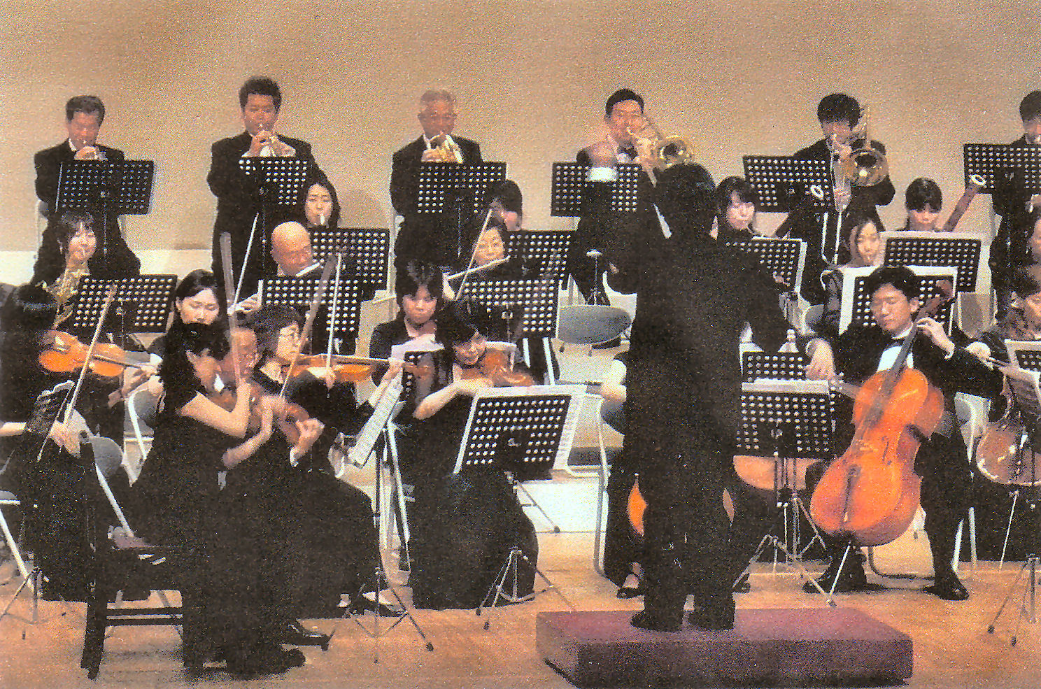 1997年にJR恵比寿駅に読売文化センターが誕生し、オーケストラ団員募集のチラシを見て夢が拡大した。フルートだけの合奏と違って、多種多様な楽器から出る豊かな音の洪水に囲まれながら、難曲と苦闘している。一番の問題は長い休止の後の始点が分からなくなってしまうことである。しかし、最初に新しい楽譜が配られた時にはとても無理と思った曲も、2週間、3週間と練習する内に何とか指が動くようになり、指揮者の顔が見えるようになってくると、曲の流れに乗って響き合う音の醍醐味を堪能できるようになる。