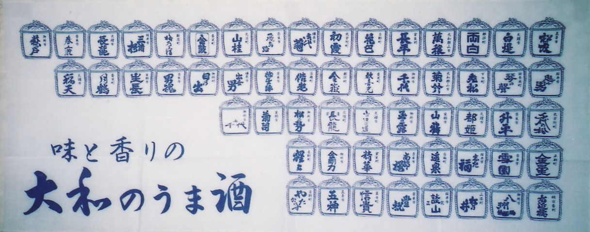 箸墓古墳、黒塚古墳(昼食)を経由、大和神社で参拝、JR長柄駅で踏み切りを西方向に渡り、3百mで飯田本店に着く。製品のブランド名は「長龍」。各2列で30人ほど並んでいて、先ずガラガラで抽選、幸運にも、手拭いが当たった。奈良の酒蔵名が書かれたもので、数は57社もある(写真)。種々試飲して終えた。