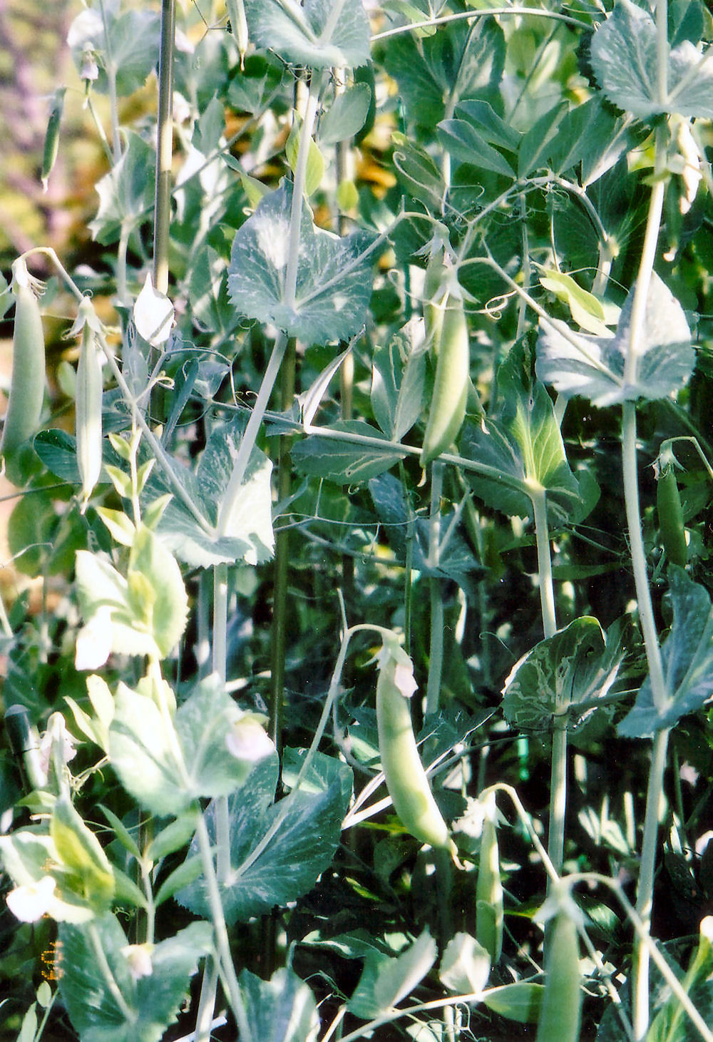 | ●写真:実がなっている様子、及び収穫後のえんどうを示す。 | ![]() |