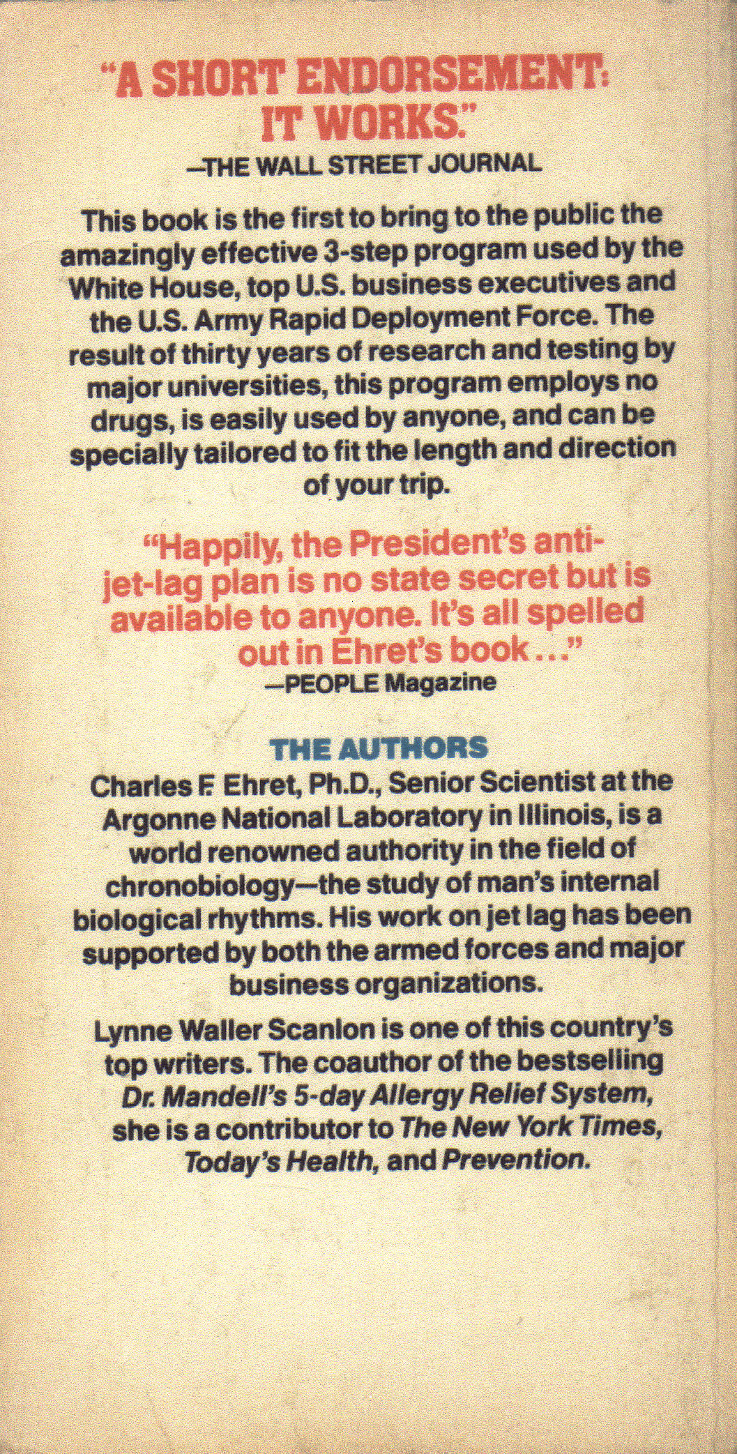 実は、この対処方法は私の発明ではない。現役時代には時差に苦しめられ、昼間に襲ってくる睡魔と闘っていたのであるが、その頃米国の空港で新書版の “Overcoming Jet Lag” を見つけた。既に読んで実行されている方も多いかと思うが、参考までに表紙・裏表紙のコピーを添付した。この書は、高齢で大統領になったレーガンが職務上の必要から専門家に有効な時差への対処法を研究させた成果が纏められたもので、時差別に3段階に分けて食事や睡眠について詳しい処方箋が示されている。NY行きのように東行き時差11、12時間の場合は、以下に要点を示すような食事への詳細な注意が述べられている。