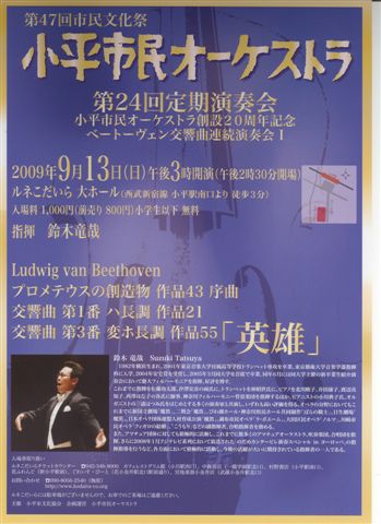 | 演奏会の詳細を下記にまとめておきます: (1)日時:2009年9月13日(日) 午後3時開演 (2)場所:ルネこだいら大ホール (西武新宿線小平駅南口徒歩3分) (3)指揮:鈴木 竜哉 (4)曲目:ベートーヴェン作曲 (i) バレエ音楽「プロメテウスの創造物」 作品43 序曲 (ii) 交響曲 第1番 ハ長調 作品21 (iii) 交響曲 第3番 変ホ長調 作品55「英雄」 |