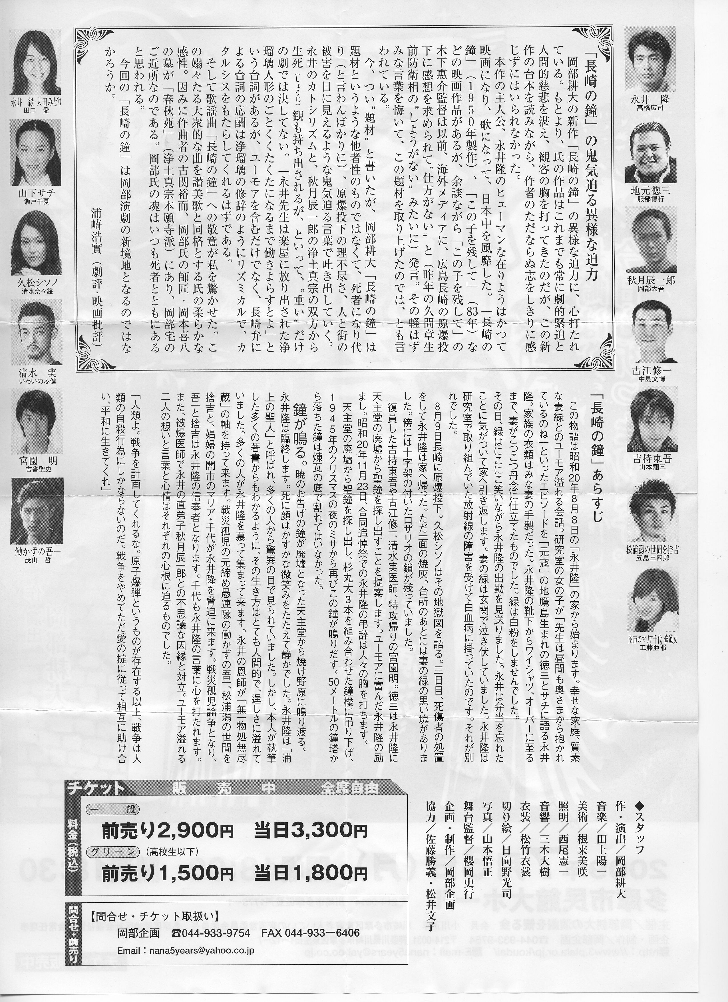 | 「長崎の鐘」のストーリーは、ブログの写真として掲載したプログラムの裏面に書いてある。拡大すれば読めると思う。原作についてはGHQとの妥協もあり、色々批判もある。原爆投下の責任を美化してはいけない。しかしこの時期に「長崎の鐘」が再演されたことは、問題提起として大きな意義がある。 | ![]() |