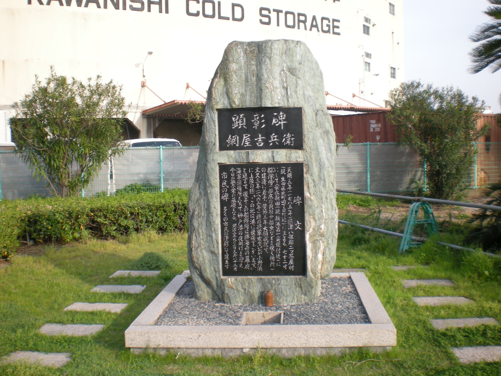 この疑問は吉兵衛の顕彰碑を訪ねて見て、解けはしないが何か判った様な気持ちとなった。神戸市役所西の京町筋を南に下り、旧海軍操練所記念碑を過ぎて更に進むと、吉兵衛の顕彰碑が静かに立っている。その碑文には彼の神戸港への功績が要約されているが、其処には勲一等など政治家や役人の名前は無く、多くの市民の賛同によりこの碑が建てられたとのみ記されている。私と同じ様に感じた人が沢山居たと判って嬉しかった。(写真 網屋吉兵衛 顕彰碑)