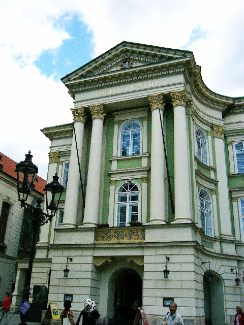 一般観光コースのカレル橋やバーツラフ広場などを見た後エステート劇場(左写真)を探した。ドン・ジョバンニや交響曲第38番プラハが初演された劇場である。すぐに見つけることができたが意外にこぢんまりとまとまった美しい劇場である。入口の所でおばさんが何かを売っている。見ると今晩8時からモーツァルト・コンサートとあるではないか。思いがけずモーツァルトからプレゼントを貰ったような気分で早速チケットを買い求めた。数人の楽士によるアンサンブルに歌手が代わる代わる出てきてオペラアリアを歌うという形式でモーツァルトを存分に堪能させてくれた。