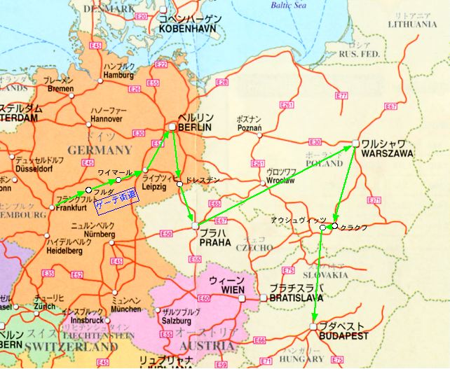 旅の仲間は私の他に男性が一人,女性が二人,何れもモーツァルト愛好会のメンバー及びその友人である。そもそもこの旅を思い立ったのはこのメンバーの一人が東欧地方は未だ行ったことがないので行ってみたいと言いだしたのがきっかけ,前回ゲーテ街道に同行した男性メンバーも誘い込んでゲーテ街道再訪と同時にその後ベルリン,ドレスデン,プラハ,ワルシャワ,クラクフ,ブダペストへと足を延ばす全行程2週間(7/1 14)の旅を計画した。