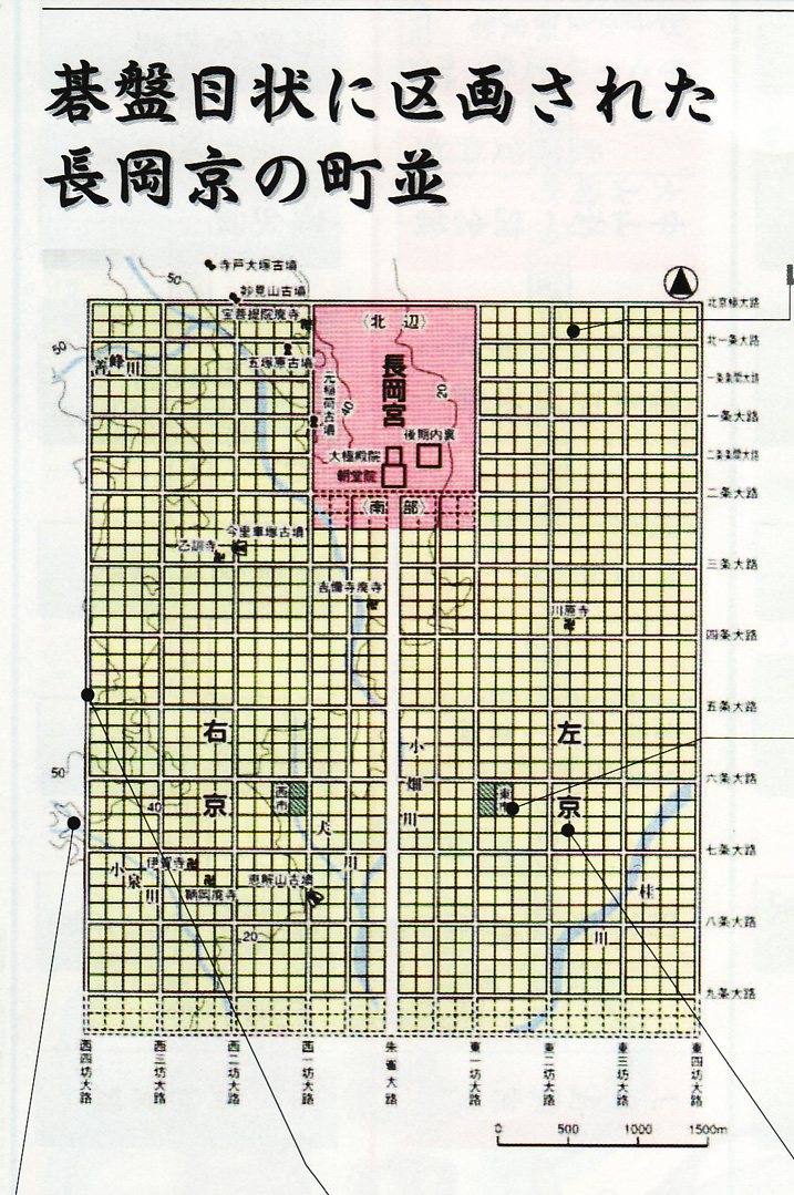 2.町の構造:長岡京の大きさは東西約4,3km、南北約5,3kmで、平城京や平安京とほぼ同じ規模である。町全体は碁盤目状に区画されていた(写真)。 そして中央北部が長岡宮であった。短期間の都であったため、主な建物は平安京に移され、長岡京は元の田畑へと姿を変えた。