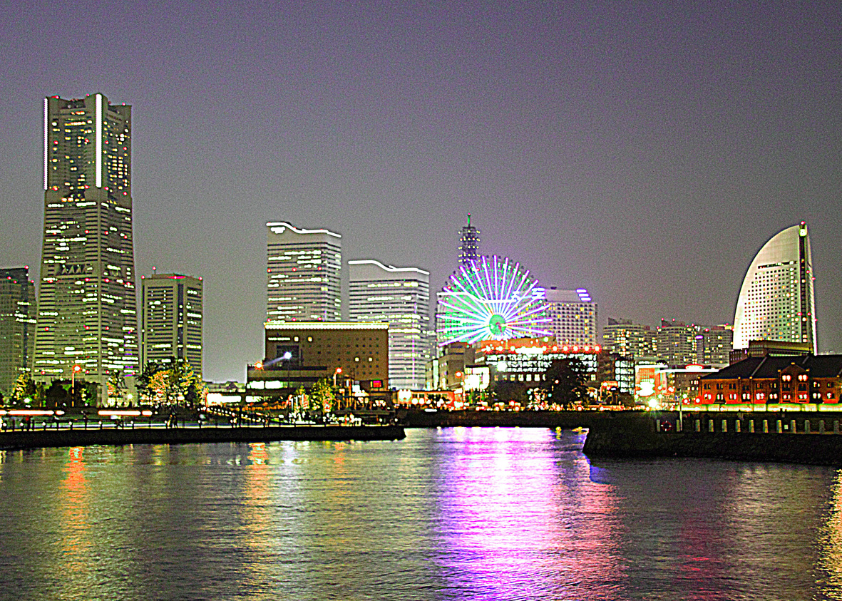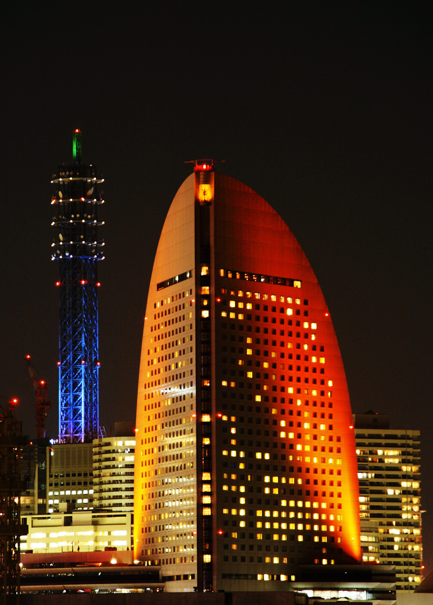 横浜の風景は、昼間も夜間も写真や絵画の題材になりますが、「光のモニュメント」は素晴らしかった。「主役」のインターコンチネンタルホテルがどっしりとして、「脇役」のNTTメディアタワーがその存在感を高め、照明に輝く高層ビル群が、「その他大勢」の役割を担っている。構図がしっかりしているので、色彩の妙が一段と冴えて見えます。