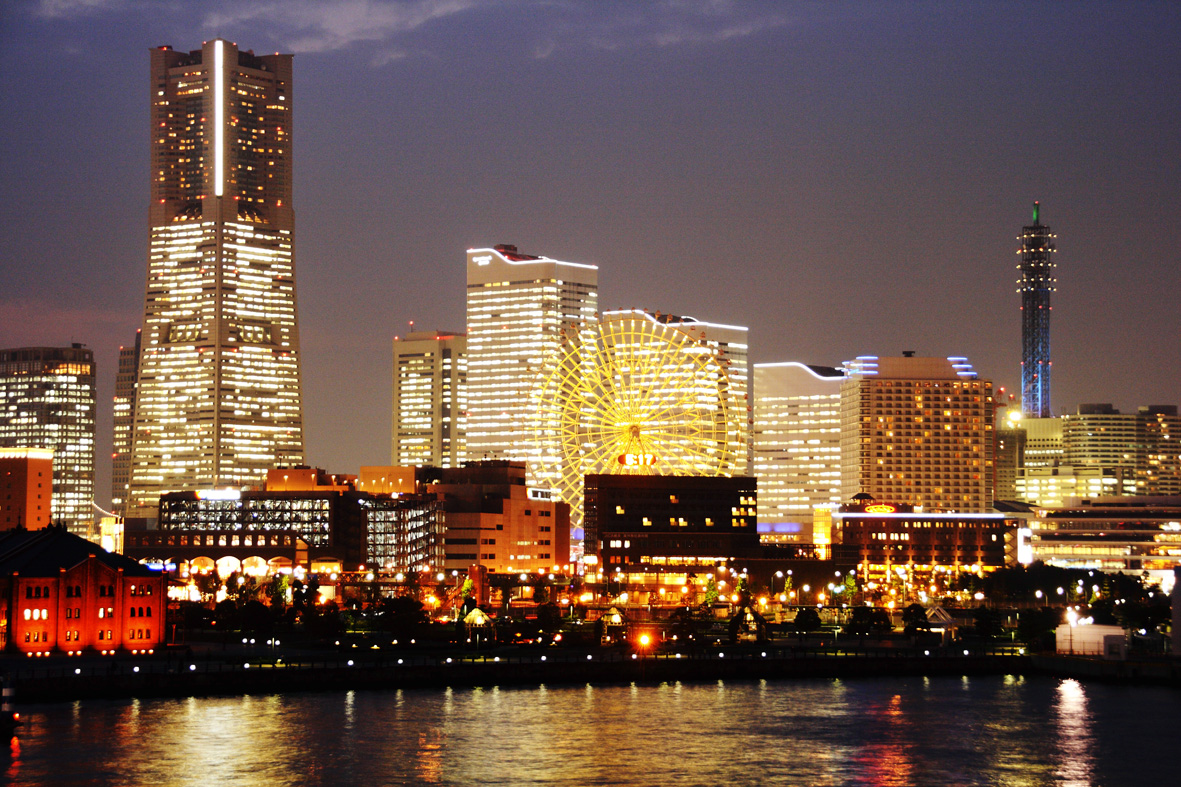 大桟橋から見たみなとみらいの夕景・夜景は昼間とは全く違った表情を見せてくれ大変魅力的である。2008/8/11の「みなとみらい写真散歩」ではまだ空が明るい時間帯の夕景を紹介したが、今回紹介するのは日没からもう少し時間が経ってからの風景で、照明に輝く高層ビル群、その手前にシルエット気味に写るビルの群れ、更に水面に反射する光などが存在感を増している。