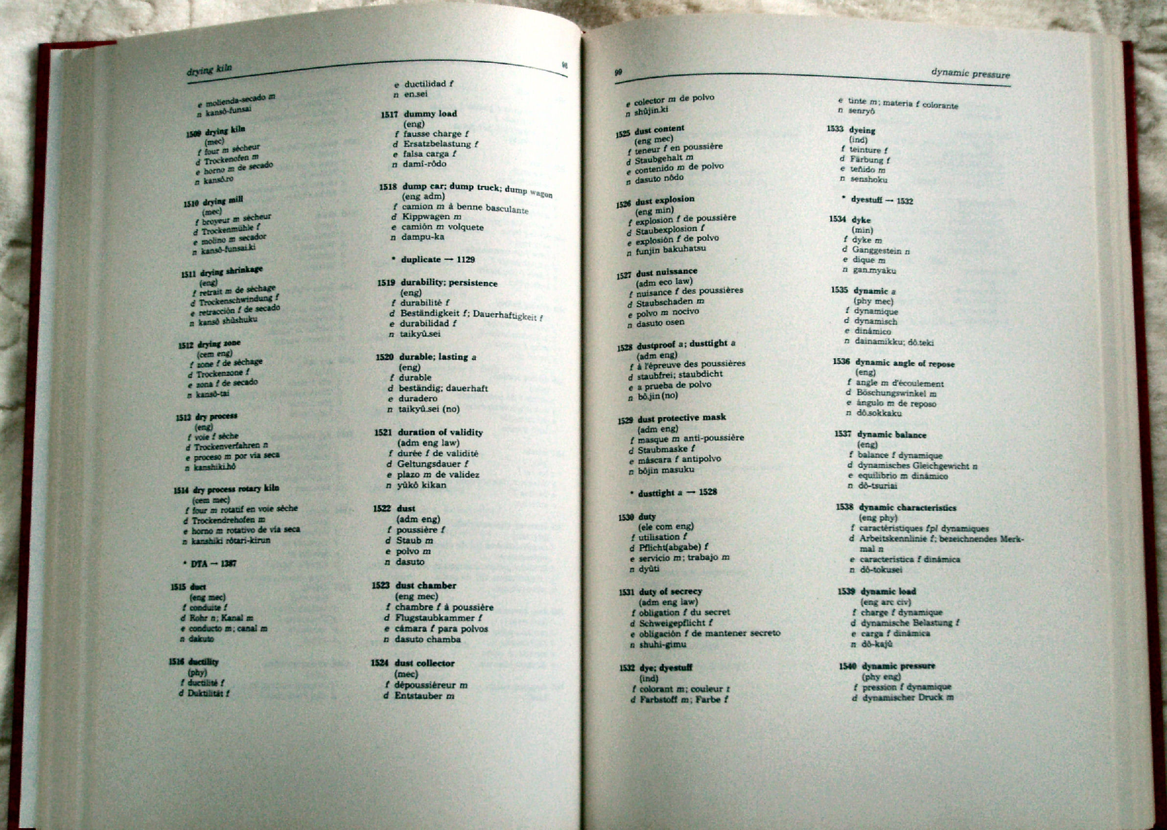 | その昔話の中で、大西君がセメント産業の用語を5ヶ国語(英、仏、独、西、日)の辞書に編纂したことを知った。彼の語学の才能に改めて強く感銘を受けた。 その後、順次体調不良になり、何時からか立ち消えになってしまい残念至極である。 (写真左:辞書表紙)(写真右:辞書内容) |