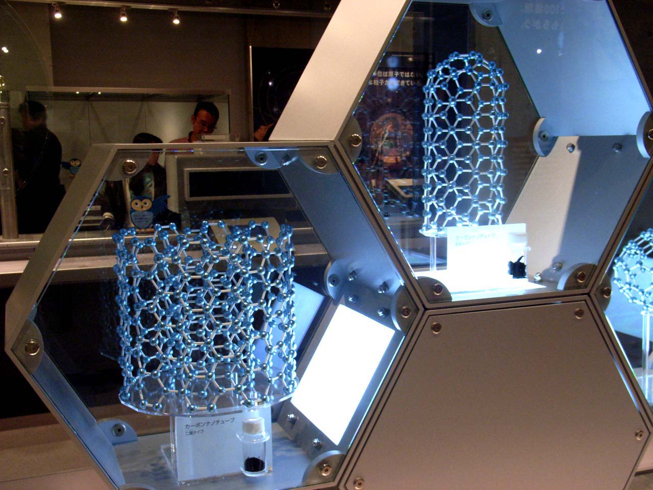 | さらにその隣にフラーレンとナノチューブ。これらはこの科博に来るまで私は知らなかった物質です。フラーレン60(C60)の分子は丁度サッカーボール。20面の正六角形と12面の正五角形がからんだ結晶です。この形は幾何学の分野では切頭20面体(truncated icosahedron) | ![]() |