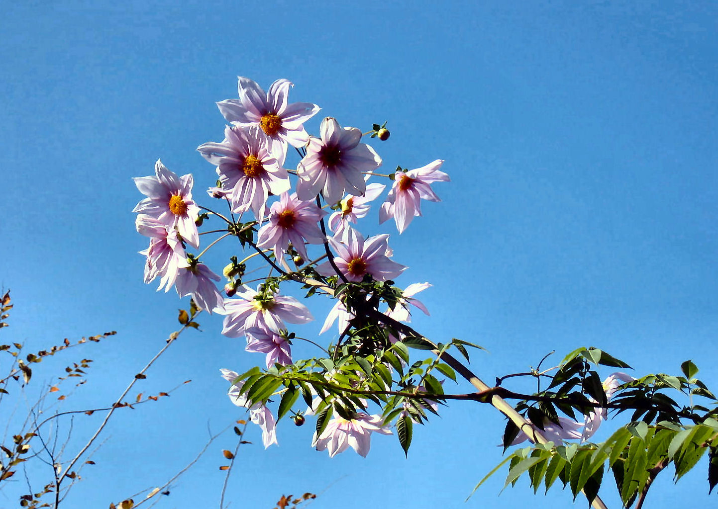 因みに、ダリア(Dahlia)は18世紀のスウェーデンの植物学者「Dahlダール氏」の名前にちなんだ命名。「皇帝ダリア」は樹木に劣らぬ立派な幹をピンと伸ばし威風堂々とした姿からの命名です。一日の日照時間が短くなると花が咲く性質を持っていることから、開花時期は11月中旬から咲き始めるようです。