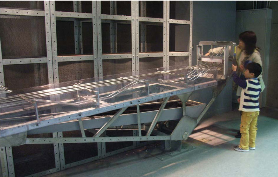 ここには3号館の高圧実験室を思い出させる小型のアーク放電、ベンハムの円盤、表面が湾曲した鏡による不思議なミラーなど20種ほどの簡単な実験が出来る器具、装置が置いてあります。“ジャイロホイール”では高速でまわした自転車の車輪を持って回転フリーの椅子に座ると、コマの原理である軸を動かすまいとする力の大きさを身体で体験できます。扇風機の風の勢いでゴムボールを空中に浮かび上がらせてゴールをくぐらせるエアバスケットにはいつも長い列ができています。