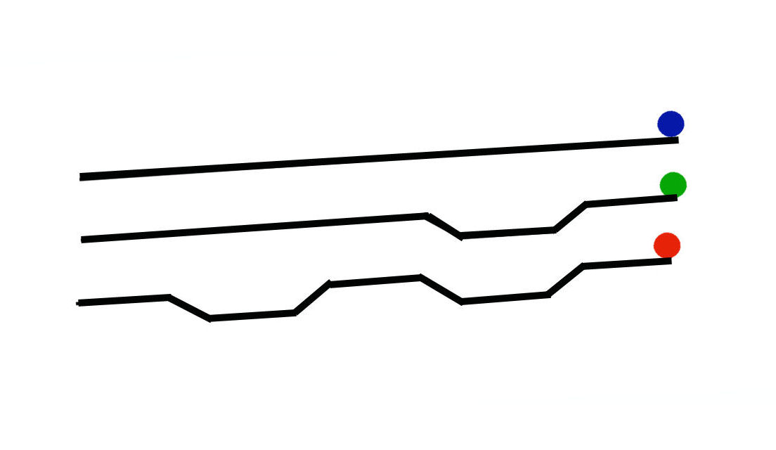 子供ばかりでなく、多くの大人の方たちも青が一番速く着くと思っています。人間は高低差のある道を歩くことの苦労を経験し、坂を上るときには速度が落ちるという先入観で、重力だけが支配する物理の世界には思いが至りにくいのです。そこに科学の世界と人間感覚の差を感じます。
