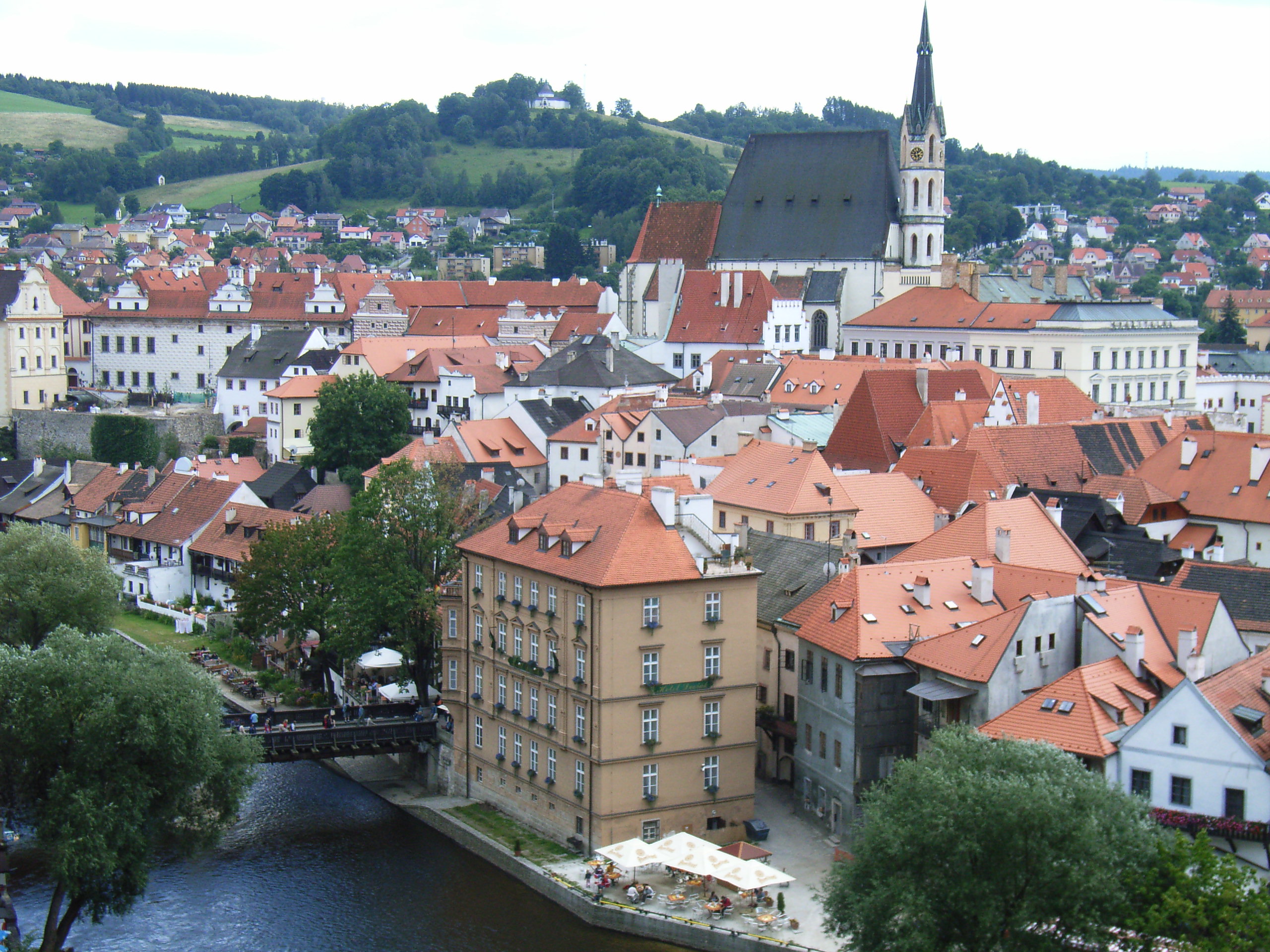 チェスキー・クルムロフは前から行って見たかった所で2007年10月に実現しました。ツアーのバスで城の北側で降りてすぐ城に入り、あと大橋兄が荷物と格闘した道を下り、ヴァルタヴァ川の橋を渡り旧市街に入って広場や教会など見物。周った順も大橋兄の記述と似て懐かしく拝見しました。快晴で城や家の赤い屋根が映えて、聖ヴィート教会隣のホテルで昼食をとったが、その奥が川を見下ろすテラスで紅葉と川の青さが見事でした。