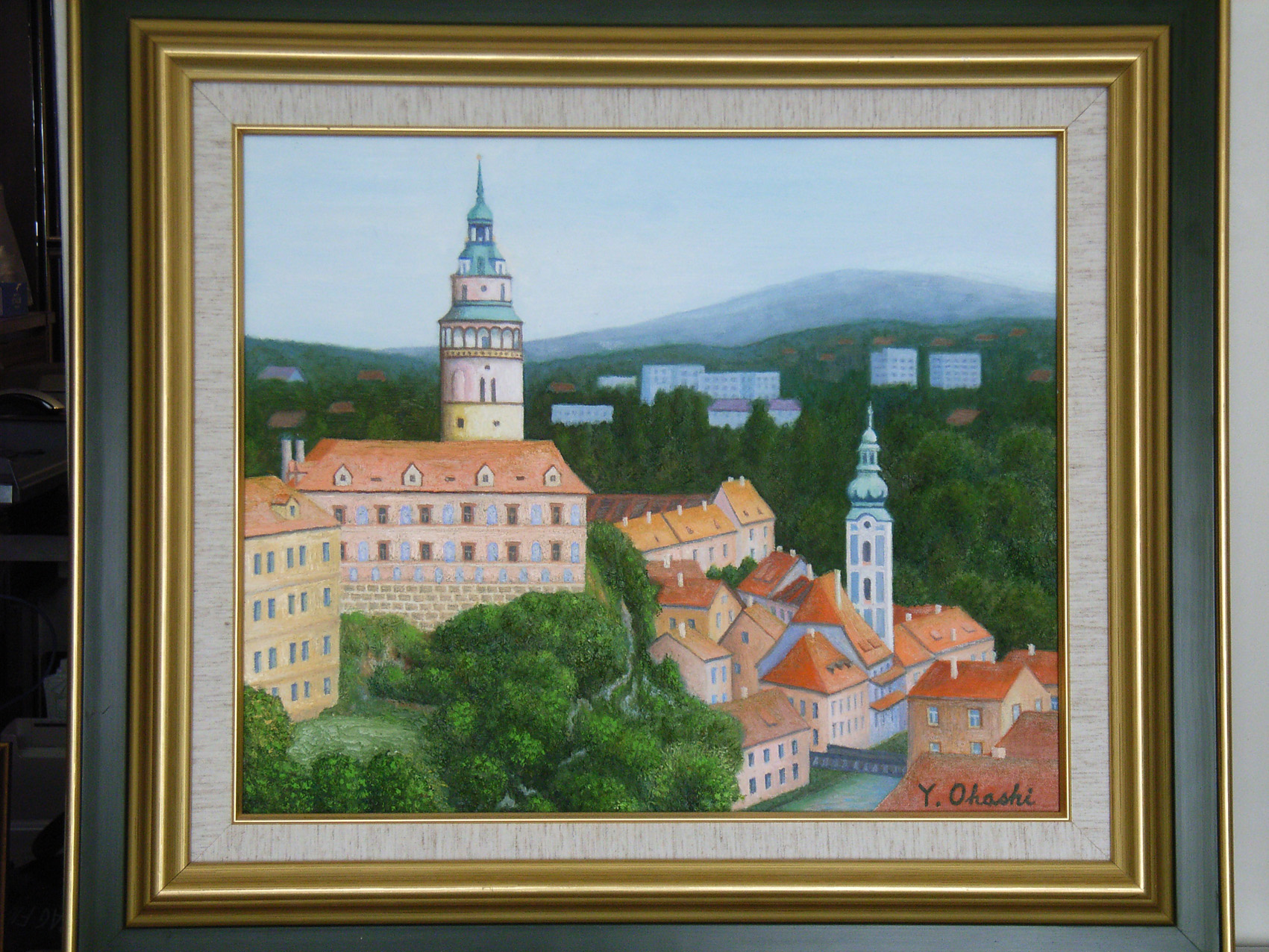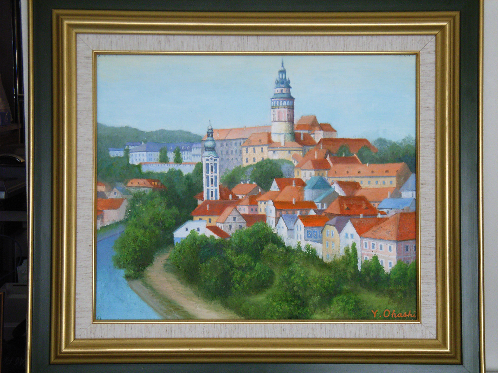 翌8月10日は、旧市街を通り抜け、ヴルタヴァ川に沿って歩き、チェスキー・クルムロフ城の全景が一番美しく見える場所を探した。丁度良い場所を見つけても近くの樹木の葉が邪魔になる。やっと道路脇の石垣の上に登って樹木の隙間から会心の1枚をものにした。ツアー客が宿泊する高級ホテルや、バス停近くの撮影スポットからでは、城の塔と教会の塔が接近していて、構図としては主役と脇役が近すぎて好ましくない。 帰国後、8号の下絵を描き、翌年更に拡大して100号の油絵に描き、上野の東京都美術館で開催された新構造展に出展した。