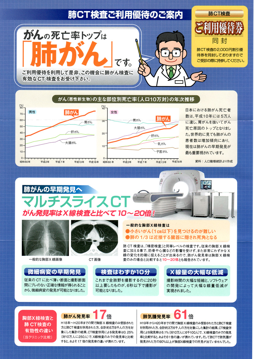 7. 付け足し:今度は肺がんの話 小生が毎年人間ドックを受けているランドマークタワーのクリニック(*)で、オプション検査にマルチスライスCT検査が追加された。この検査はがんの発見率がX線検査より10-20倍高いそうで、肺がんの早期発見に大変有効である。 パンフレットのコピーを右上に示す。 (*) URLは http://www.ams-dock.jp/landmark/