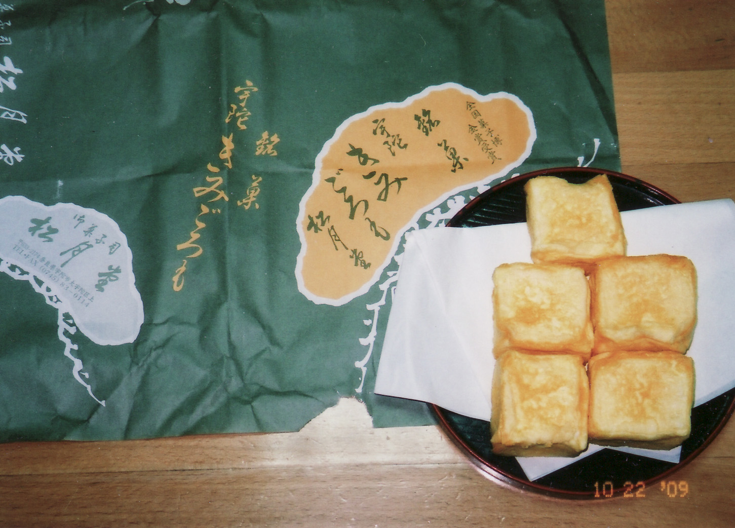 前記街並の途中にこの店がある。写真のように1辺が約4cmの直方体で、中身は卵の白身から作るメレンゲであろうが、表面は薄茶色に焦がしてある。押し潰せば体積は殆どゼロになる程柔らかいが、口に入れると香りと甘味が口中に広がって、美味しい。関西ではここでしか買えないであろう。