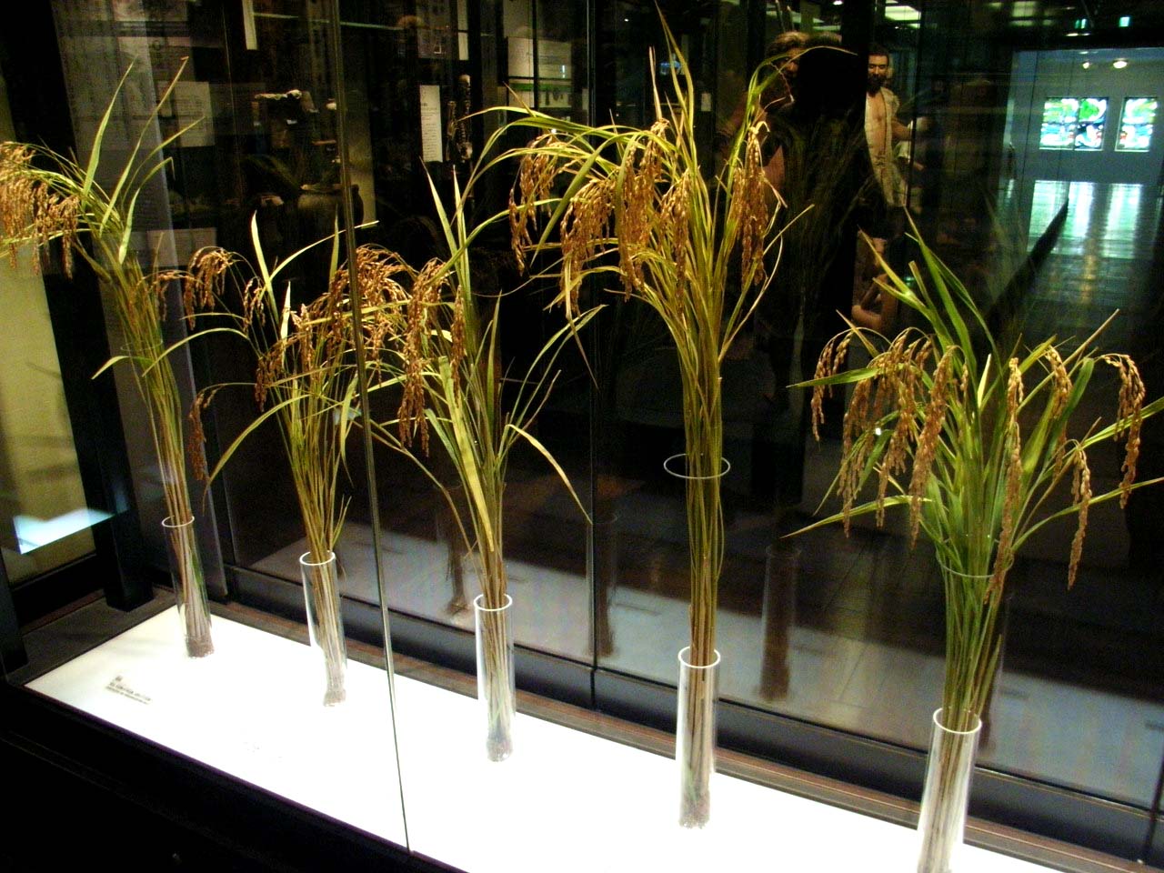 それまでの小さな家族単位の生活では出来ない共同作業の必要にも迫られたでしょう。イネがもたらされたのは北九州の暖い水の豊な土地でしたが、その耕作が次第に東へ北へと広がっていくと寒冷への対策が必要になります。イネの改良の過程を同じフロアの展示に見ることが出来ます。昔の旭、愛国から始まって私たちになじみの深い農林1号。これは先月新田さんに頂いたコメントにもありました。そして近年ではササニシキ、ヒトメボレ、コシヒカリ。台風、病害への対策と同時に収量も増え、味も一層おいしくなりました。寒い北海道で育つように改良されたキララ397と本州種のササニシキが寒冷の地でどのように生育が異なるかも展示されています。