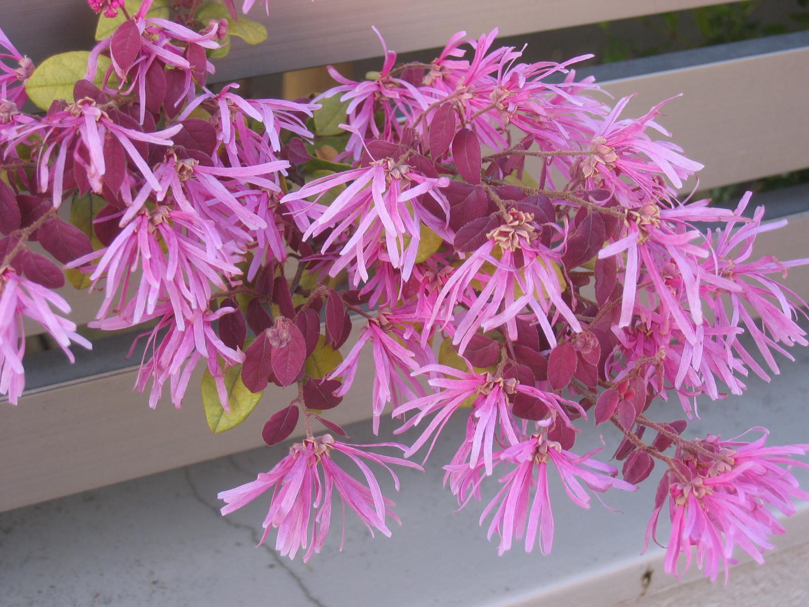 左:べにはなときわまんさく(紅花常盤満作)(4月17日撮影、川崎市宮前区内、散歩の途中で)