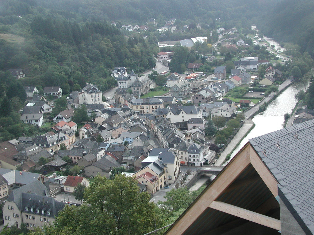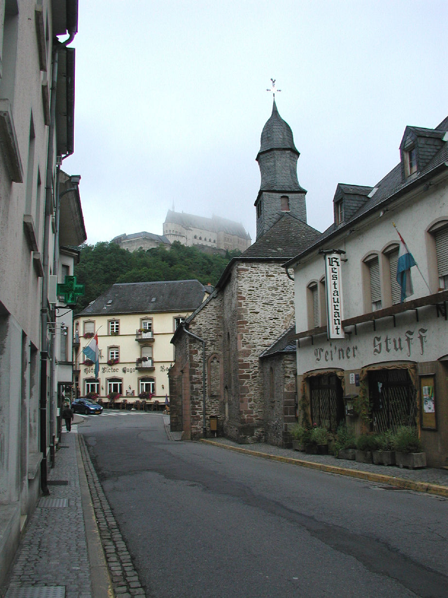 | 8月22日朝、ルクセンブルク中央駅を出発し、約40分列車で車窓から緑の美しい景色を眺めながら、エテルブルク(Etterbruck)駅に到着した。ここからバスに約30分乗ってヴィアンデン(Vianden)に到着した。バス停から約5分で城に到着すると案内書には書いてあったが、途中で写真を撮ったり、且つ坂道が老体には結構応えた。 |