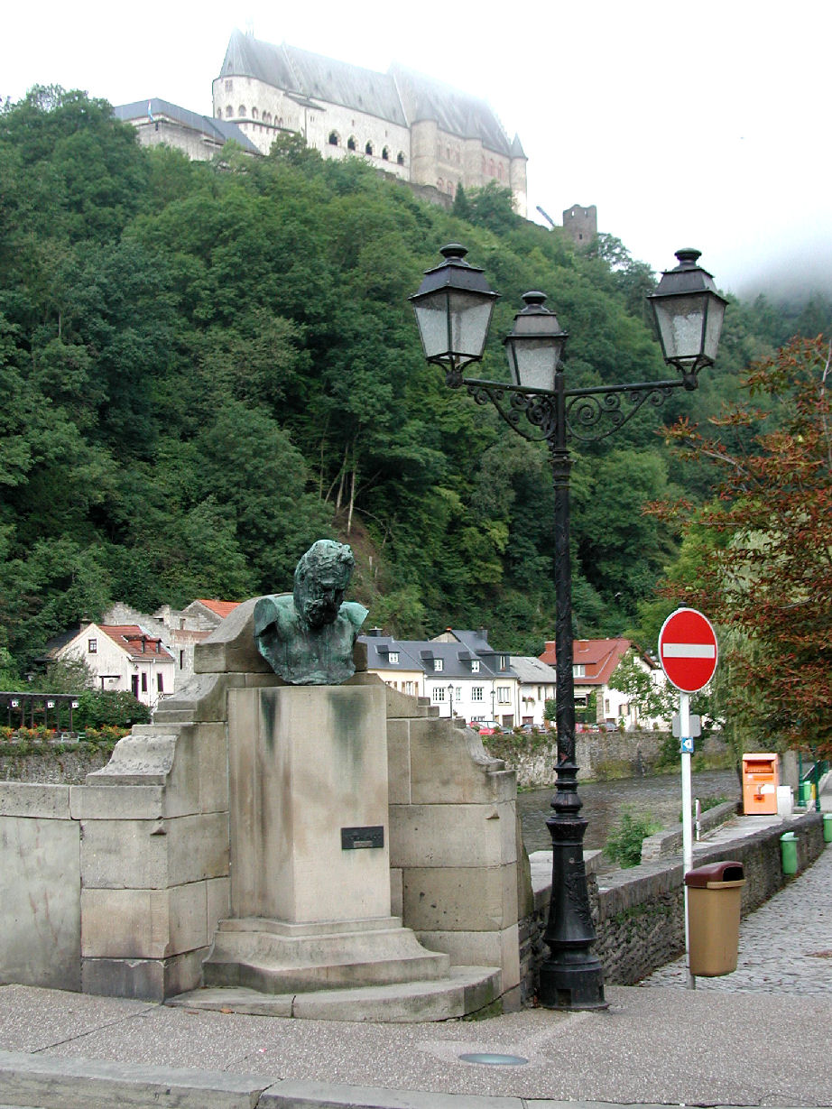 バス停から城に向かって進むと、正面にホテル・ヴィクトル・ユーゴが現れる。その上にヴィアンデン城が霞んで見えた。(写真1)ホテルの向い側に観光案内所があり、左折すると橋がある。橋のたもとにユーゴーの胸像がある。(写真2)彼は荒廃した城の修復を熱心に呼びかけていたが、亡命中の1871年にこの町に滞在した。