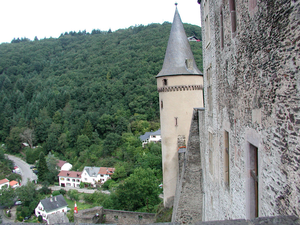 橋を渡って洒落た市庁舎などを眺めながら坂道を登ると、ヴィアンデン城が頭上に大きく現れてくる。(写真3) |