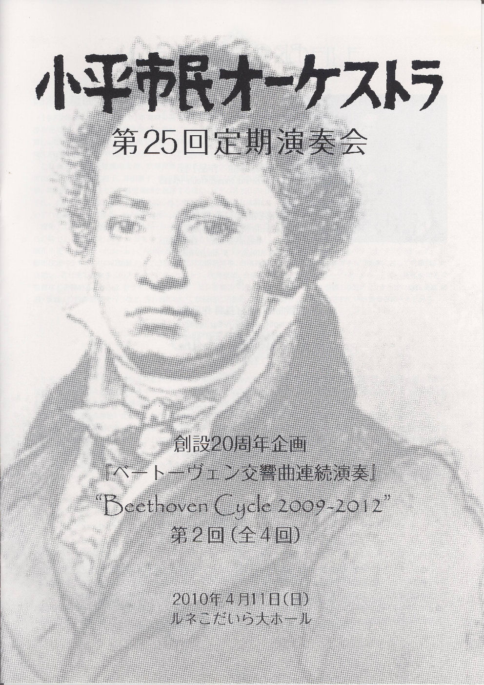 | (いわゆる「ベートーヴェン・チクルス」)の第2回目の演奏会(第25回定期演奏会)が下記プログラムにより4月11日(日)に開催され、多くの方々のご来場をいただきました。(ご参考までに当日のプログラムの表紙を添付しました) 日時:2010年4月11日 午後2時開演 場所:ルネこだいら(小平市民会館) 大ホール | ![]() |