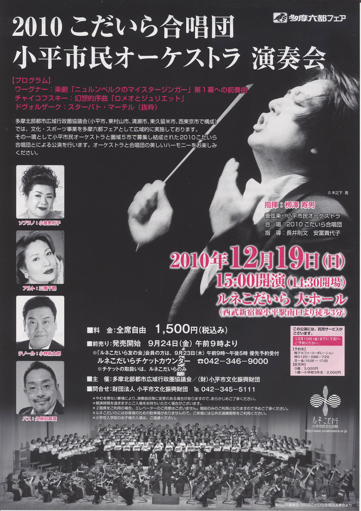 私の所属している「小平市民オーケストラ」では恒例として2年に1回のペースで年末に合唱団との合同公演を行っており(前回2008年はベートーヴェンの第九交響曲「合唱付」)、今年は ドヴォルザークの「スターバト・マーテル」の抜粋を合唱団と共演します。