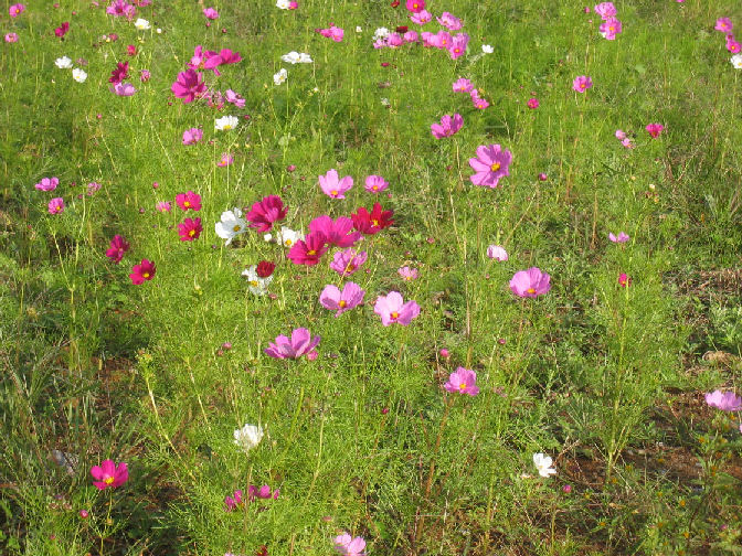 昨年の10月の花便りと撮影日は違うが、何か密集度が小さく、さびしいコスモス畑でした。【花言葉=乙女の純潔・真心・美麗、(ピンク)(少女の純潔)、(赤)(調和)、(白)(美麗・純潔・優美)】