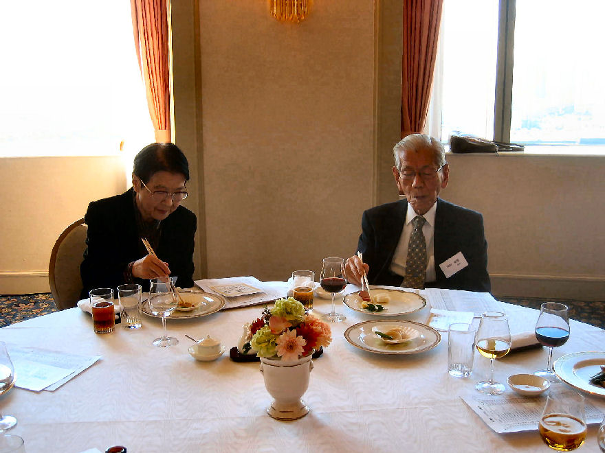 | 二部形式で実施し、第一部は中華料理を着席して食事しながら進行しました。最初に乾杯の音頭を最遠方から出席した西兄がとり、次いで大曲代表幹事が挨拶をしました。スピーチは岡村先生のお話、次に田宮様のお話、更に級友の斎藤、秋山、寺山、宅間、吉沢各兄の話を聞きながら、楽しい時間を過ごしました。 | ![]() |