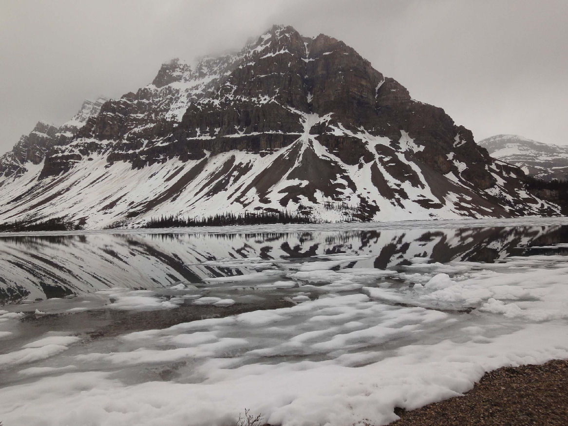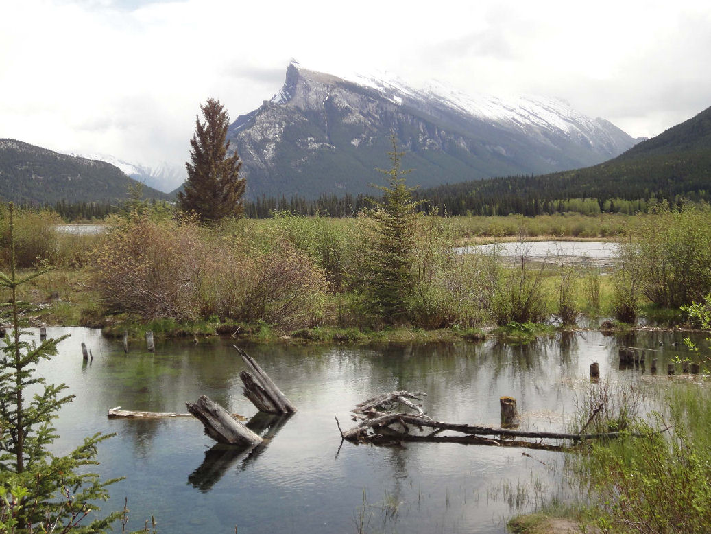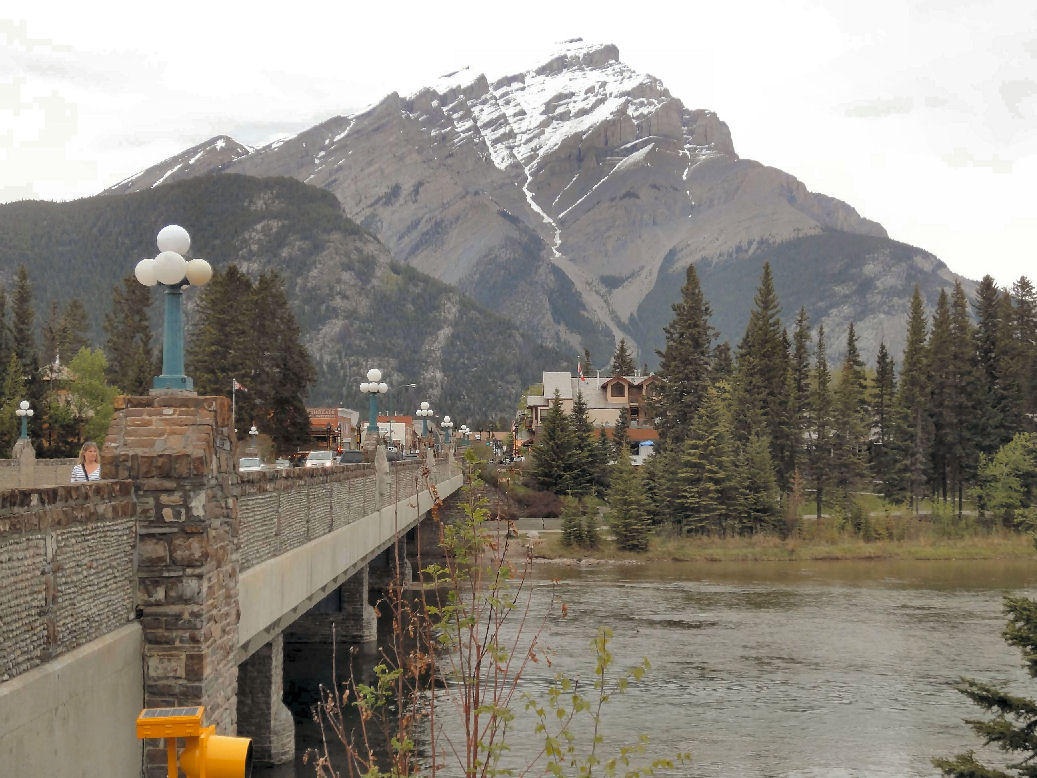 現地ツアーの予約と送迎を担当されたKさんの車でハイウエイを西走して、夕方前にはBanff のロッジに到着。早速街を散策し、ボウ橋からノーケイ山を撮影した。(写真1)