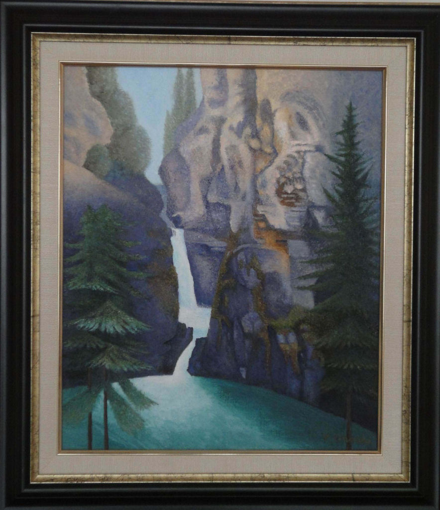 6月8日はヨーホー国立公園へ行く現地ツアーに参加したが、シーズン前でツアー客は家内と2人だけであった。天気は快晴に恵まれ、ガイドKさんの運転で、先ずジョンストン渓谷を訪れた。予約メールで77才だから滝まで行けないかもと連絡していたが、登山靴を履いていたので、大丈夫と太鼓判を押してもらった。途中の渓谷も素晴らしい眺めであったが、無事到着した滝で撮影した写真を8号の油絵に描いた。(油絵1)実物は遥かに迫力がある。