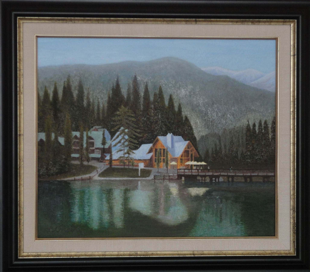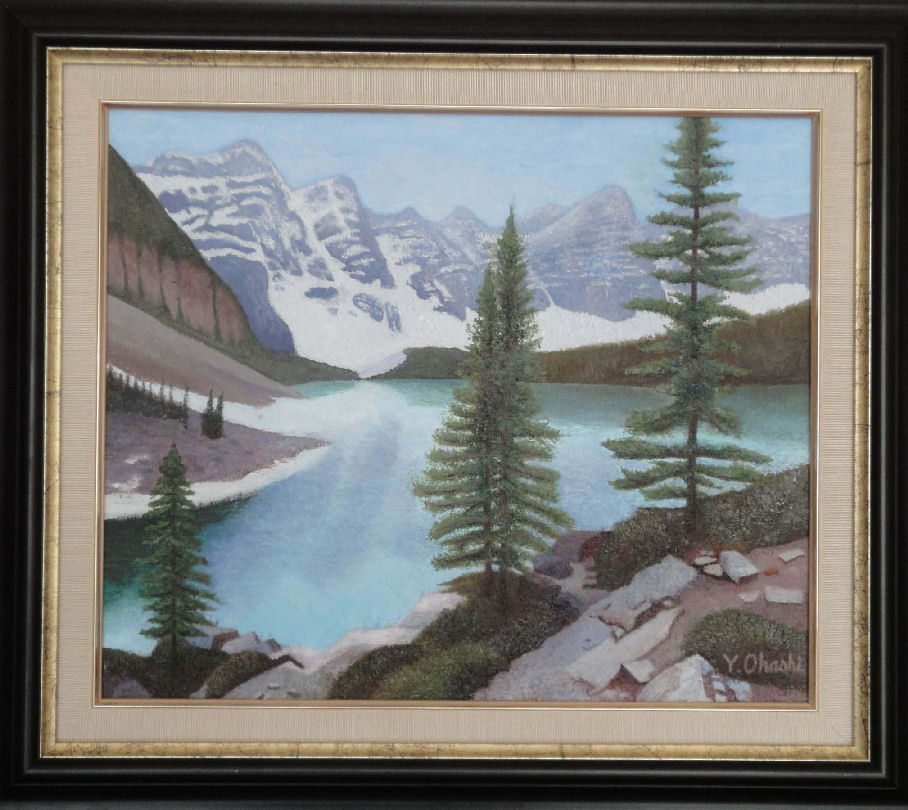 午後は先ずエメラルド湖を訪れた。神秘的な湖面に浮かぶカヌーが印象的だった。Kさんに「今日眺めた風景で何処が一番よい油絵になりますか。」と尋ねられた。躊躇なく「エメラルド湖です。」と答えた。Kさんの兄上は日本画の有名な画家である。帰国後、一番気に入った構図を8号の油絵に描いた。(油絵3)9月に有楽町駅前の交通会館2Fで開催された「本明会展」に出展したところ、「努力賞」を受賞した。