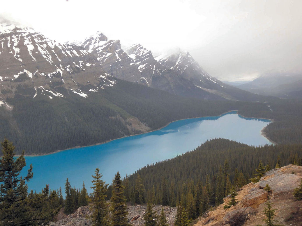 | 6月9日は小雨が降り、ガイドのSさんが予定を変えて、午前中に北方のペイトー湖(写真4)やボウ湖(写真5)を訪れた。ペイトー湖の湖面は文字通り紺碧であった。 |