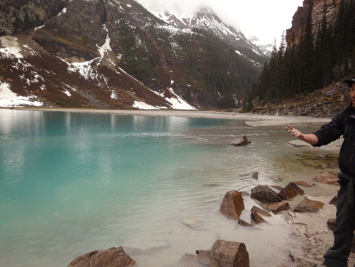次いで今回最大の目的であったモレーン湖を午前中に訪れた。湖面が解氷した直後で一番美しいそうだ。旧カナダ20ドル札に印刷された理由がわかる。 |