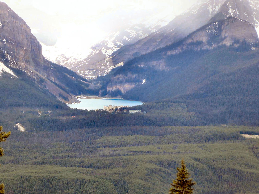 私達はフリーだったので、麓のレストランで昼食をとり、体を温めていたら晴れてきた。ゴンドラの乗り場で、もう一度だけなら使用済みの切符を使ってよいと言われ、再び中腹に登り、展望台からルイーズ湖(写真7)を撮影し、更に展示館を見学してDVDも鑑賞できた。