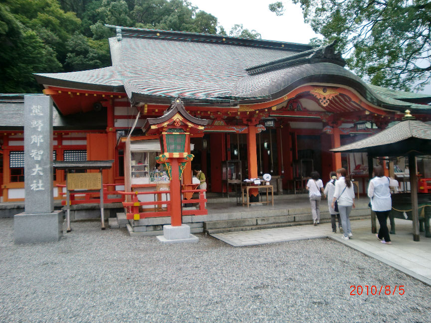 途中に石段が257段あり、全体で640mの長さである。石畳が凸凹しているし、雨で濡れていて滑りやすく、歩きにくかった。汗を拭き拭き、一歩ずつ踏みしめて登った。1時間近く登って、やっと那智大社に着いた。つくづく昔の人は大変だったろうと思った。