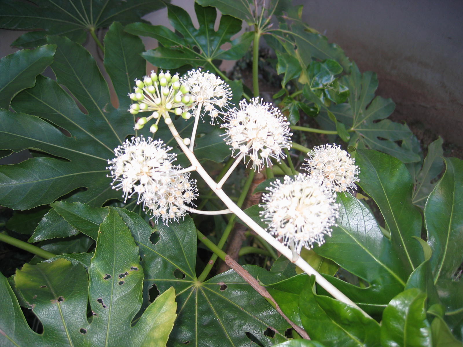 花言葉は「分別・親しみ・健康」など。因みに「ヤツデ」と言うから葉は8枚かと思いきや、(5,7,9)枚のようです。9枚の場合に切れ目が8か所と言う意味のようです。俳句では「やつで」・「花八手」・「八手の花」は初冬の季語だそうです。