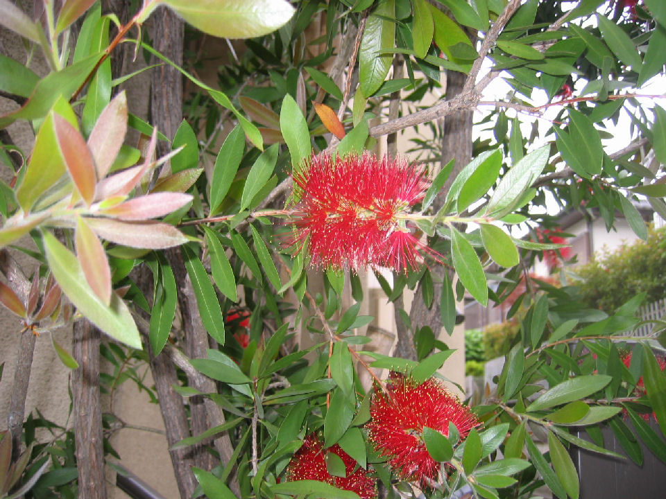 ●ブラシノキ:(6月1日撮影、川崎市宮前区内の民家の庭先で) 花言葉=「気取る心・はかない恋」 オーストラリア原産、明治中期に渡来。