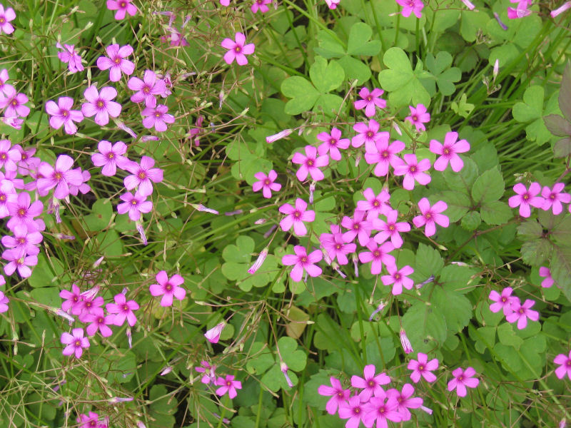 ●ムラサキカタバミ:(6月20日撮影、自宅付近の道端で) 花言葉=「喜び・心の輝き・夢の中へ等」 南アメリカ原産、別名「キキョウカタバミ(桔梗片喰)」
