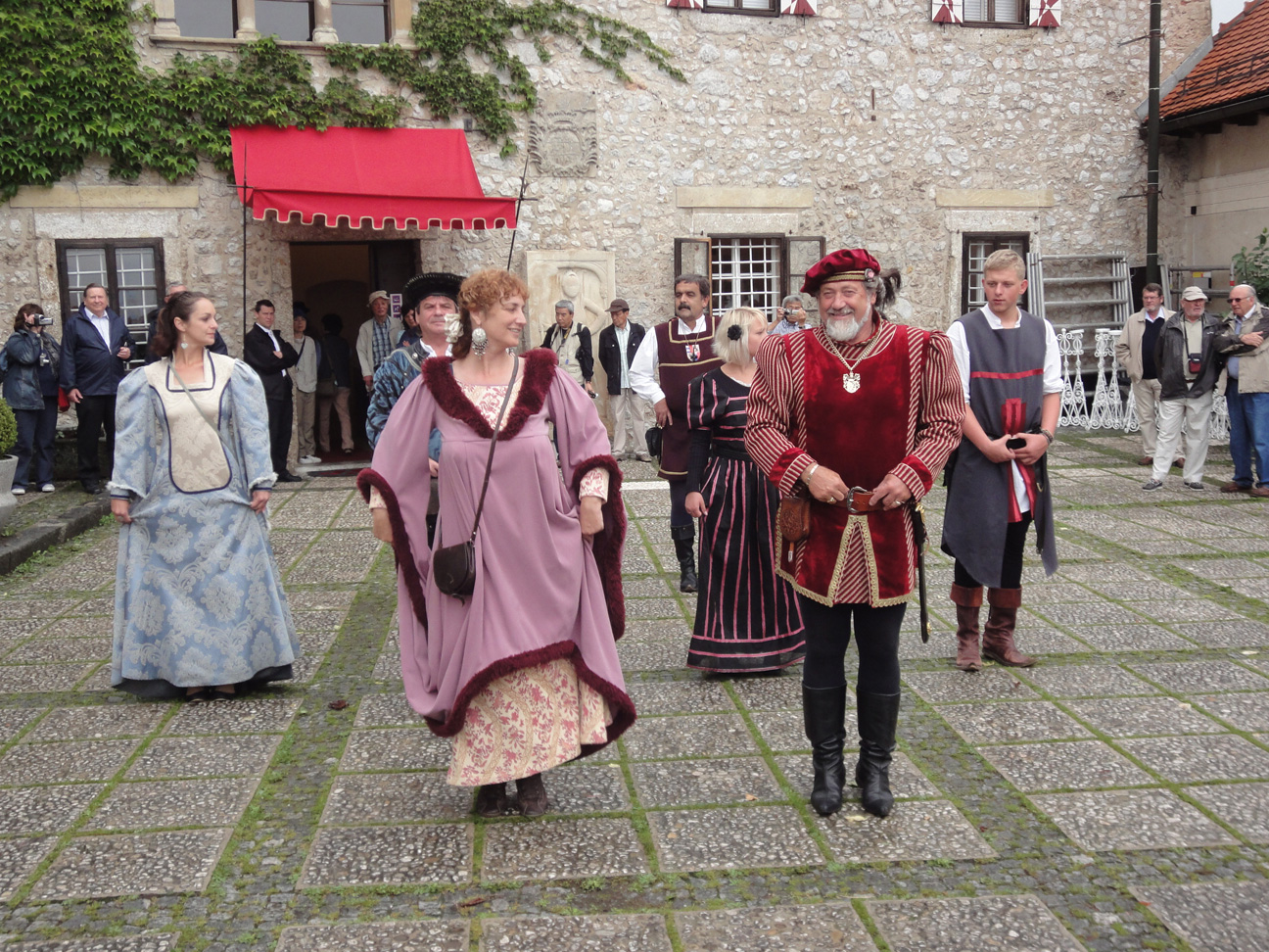 再び若い船頭さんが漕ぐプレトナ・ボートで湖畔に戻り、バスで崖の上に築かれたブレッド城(写真3)を訪れ、城内で昼食。ここからのパノラマ風景は素晴らしい。しかも城の中庭で民族舞踊(写真4)を見物することができた。