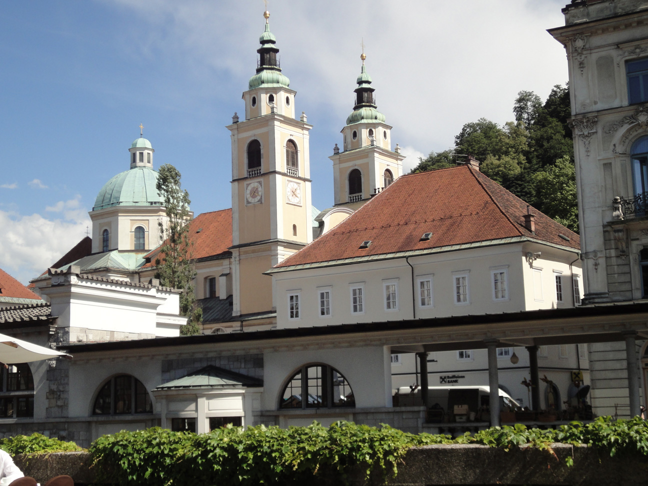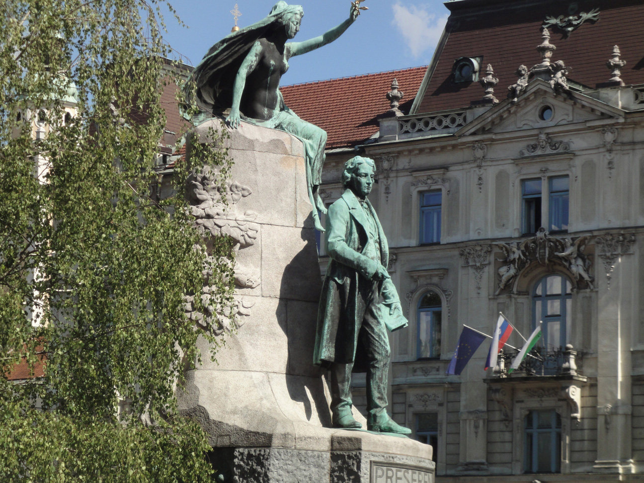 午後は、バスで1時間15分、首都のリュブリアーナを訪れた。市の中心部に、プレシェーレノフ広場がある。リュブリャニツァ川を境に新市街と旧市街があるが、これらを結ぶ小さな三本橋のたもとに、19世紀の詩人フランツェ・プレセーレノフの銅像(写真5)が建っている。彼の詩が、1991年の独立戦争後、スロヴェニアの国歌になっている。広場に面してピンク色のフランシスコ会教会がある。