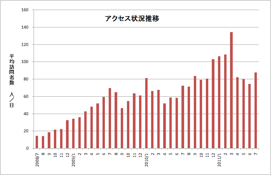 スタート以来のアクセス状況推移を下のグラフに示します。 (2008年7月は28~31日の4日間、2011年7月は25日までの集計)